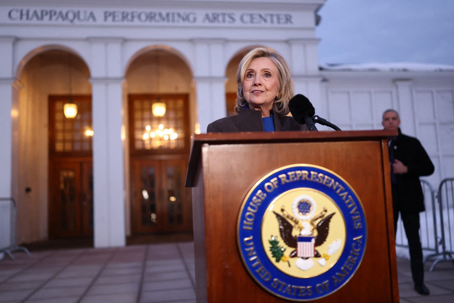 Former U.S. Secretary of State Hillary Clinton speaks to the press after her a deposition with the Republican-led House Oversight Committee as they investigate links to convicted sex offender Jeffrey Epstein, in Chappaqua, New York, on Thursday. Clinton testified behind closed doors on Thursday before a congressional committee investigating the late convicted sex offender Jeffrey Epstein and his accomplice Ghislaine Maxwell. (Photo by Charly Triballeau / AFP via Getty Images)