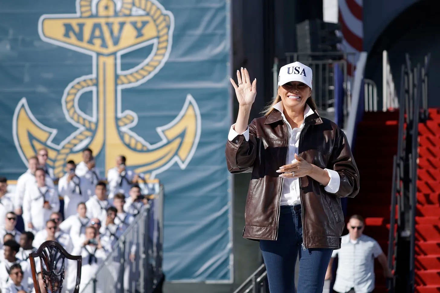 Melania Trump Channels ‘Top Gun’ in Leather Bomber for Naval Station Visit