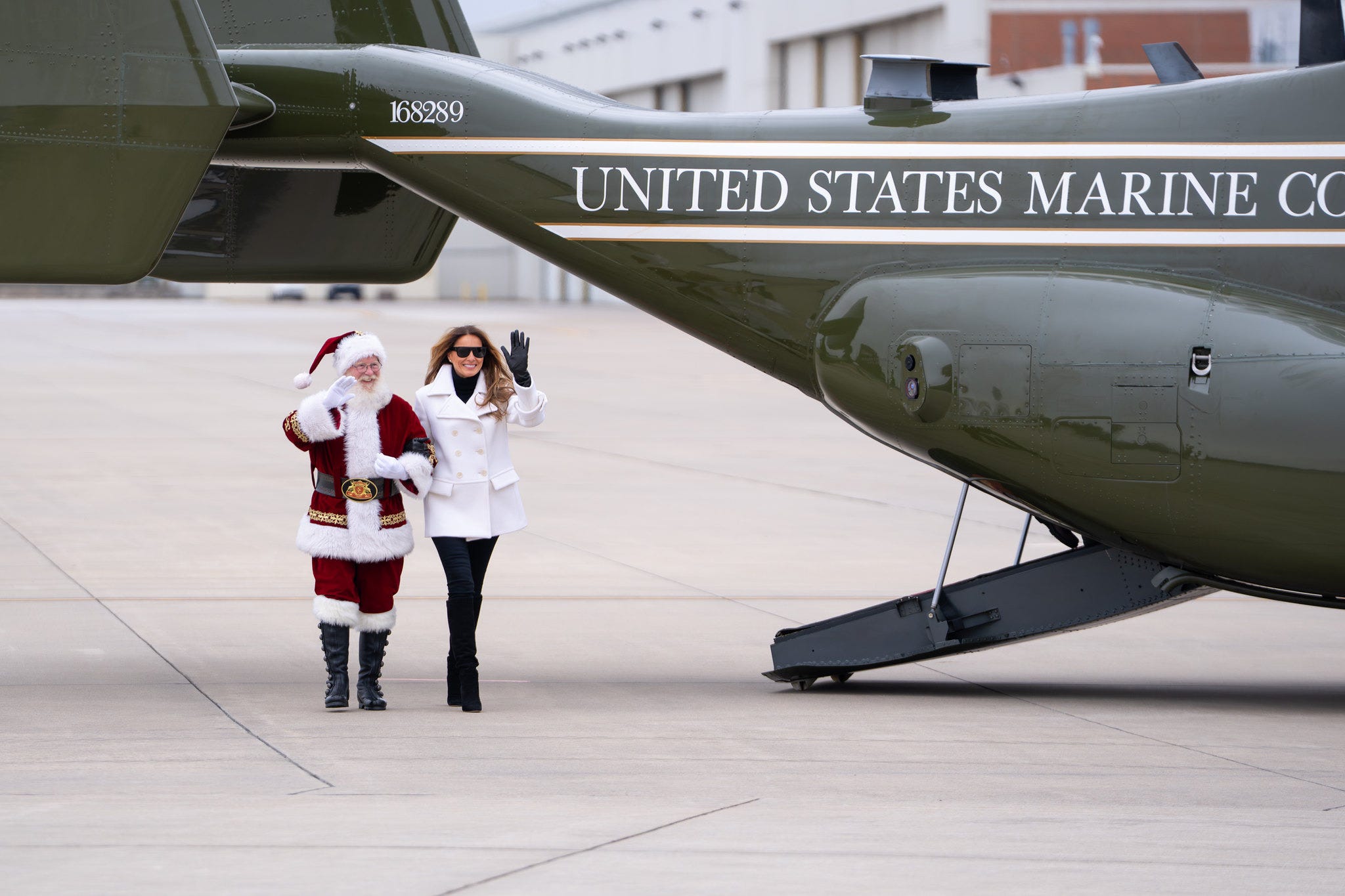 First Lady Melania Trump arrived with Santa Claus on Monday at Marine Corps Base Quantico with Santa Claus aboard a V-22 Osprey. There, the first lady joined United States Marines, volunteers and military families to continue the more than 75-year Toys for Tots tradition bringing holiday gifts to millions of children across America.