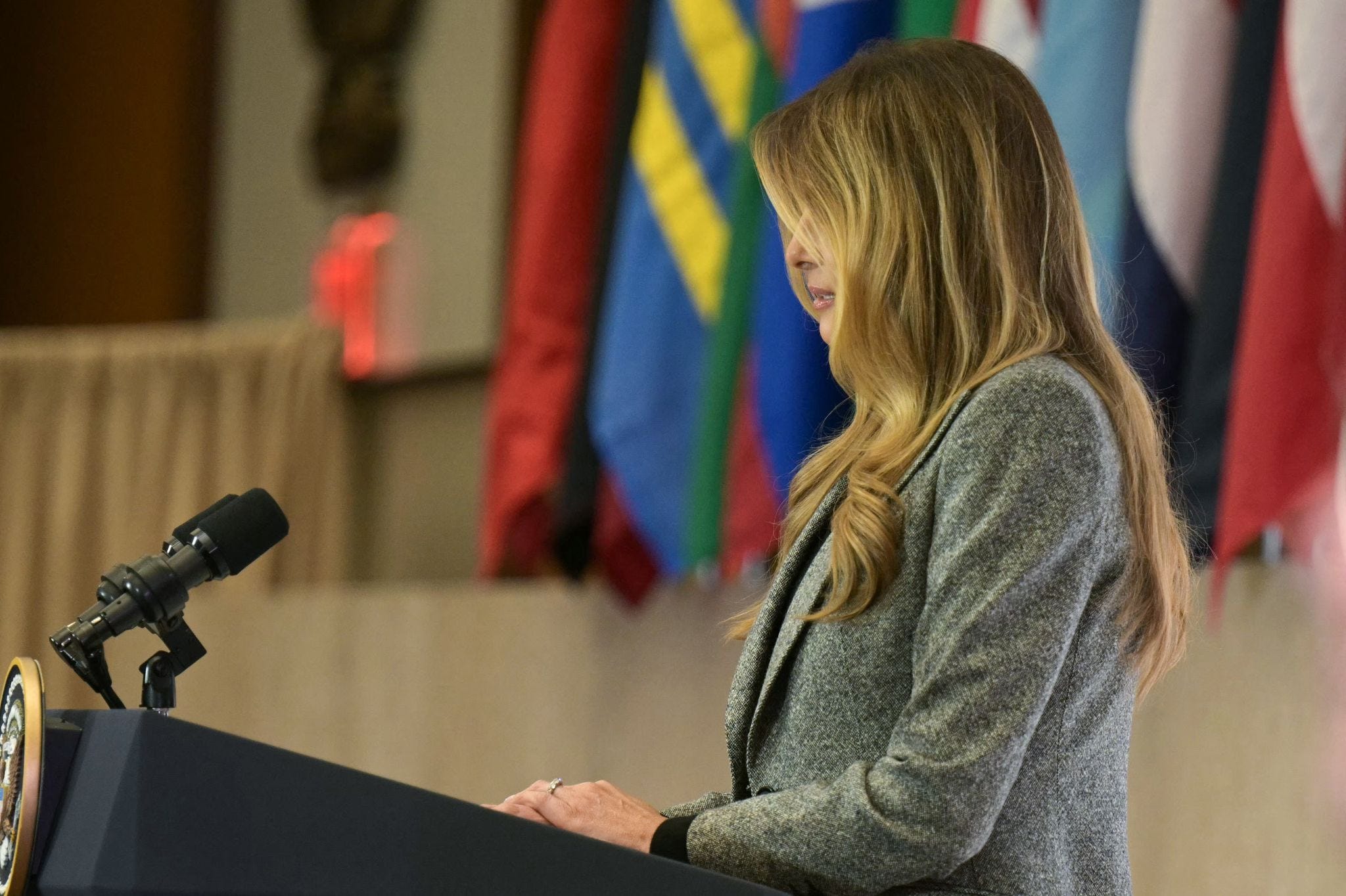 First Lady Melania Trump speaks as she hosts the Fostering the Future Together Global Coalition Summit at the State Department in Washington, D.C., on Tuesday. (Credit: Oliver Contreras / AFP via Getty Images)