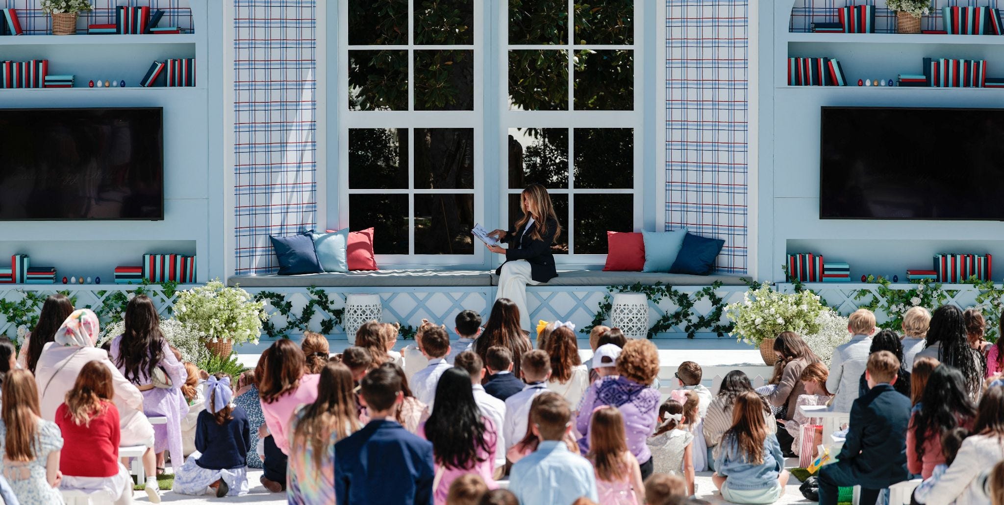 Earlier, the president and first lady, surrounded by families with children, blew whistles starting the East Egg Roll, of which their grandchildren also participated. From there, the president and first lady joined children at a coloring table where they chatted with children and signed military cards. At the Reading Nook, located on the new Rose Garden patio and surrounded by young children, babies and parents, Mrs. Trump read The Runaway Bunny, by Margaret Wise Brown and illustrated by Clement Hurd.