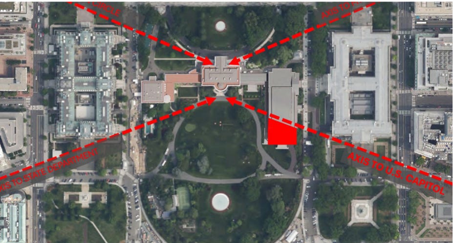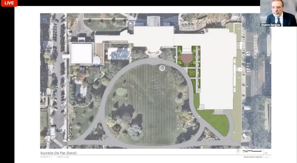 Also at issue was how the size of the proposed East Wing introduces an imbalance between the structures with the ballroom dominating. Additionally, experts argued how the axis view on Pennsylvania Avenue from the White House to the Capitol—a foundational, intentional design by George Washington’s 1791 federal city commissioned designer Pierre Charles L’Enfant—would be forever obstructed by the ballroom. And, they raised issues with symmetry, a tenant of the White House’s classical design, as a result of the ballroom’s imbalance and how the structure would protrude into the South Lawn driveway creating a kink in its overall circular symmetry.