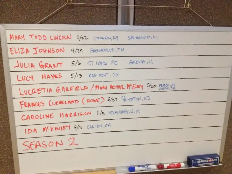 The first show would air on President’s Day 2013. Och was handed a large red phonebook-sized book containing The First Ladies Fact Book, by Bill Harris and revised by Laura Ross, and information about historical first ladies locations. With that, he combed through the pages reading and planning and, along the way, collecting other books about these women.